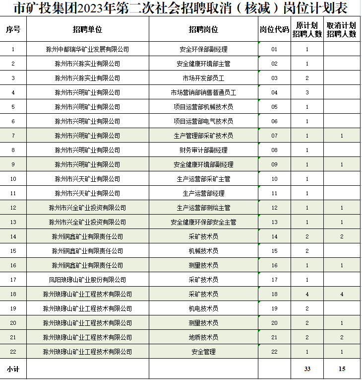 根據(jù)《滁州市興滁礦業(yè)投資集團(tuán)有限公司2023年第二次社會(huì)招聘公告》規(guī)定,經(jīng)對各崗位報(bào)名情況篩查審定,結(jié)合資格復(fù)審情況,部分崗位報(bào)名情況未達(dá)到開考比例,經(jīng)研究決定取消以下崗位招聘計(jì)劃: